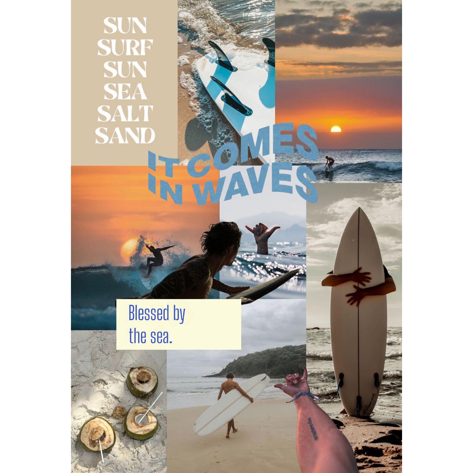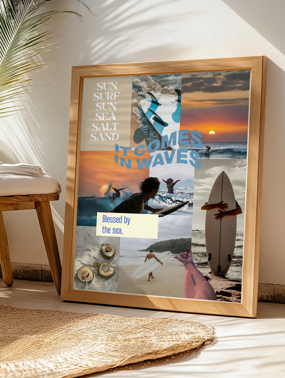 Salzige Haut, warme Sonnenstrahlen auf deiner Schulter, die Freiheit zwischen zwei Wellen. Dieses Poster ist für alle, deren Herz im Takt der Gezeiten schlägt.